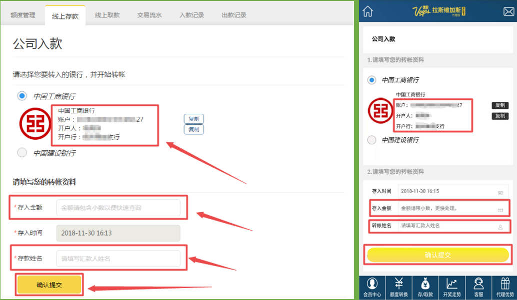 电脑用户:进入公司入款页面,选择并记录好公司收款银行账户,登陆您的网银/手机银行进行转账,或者到银行柜台/ATM进行汇款;转账成功后,填写存入金额(精确到小数点),存款姓名(所使用的扣款银行卡户主姓名),点击确认提交。(温馨提示:务必先转账再确认提交, 否则财务人员查询不到